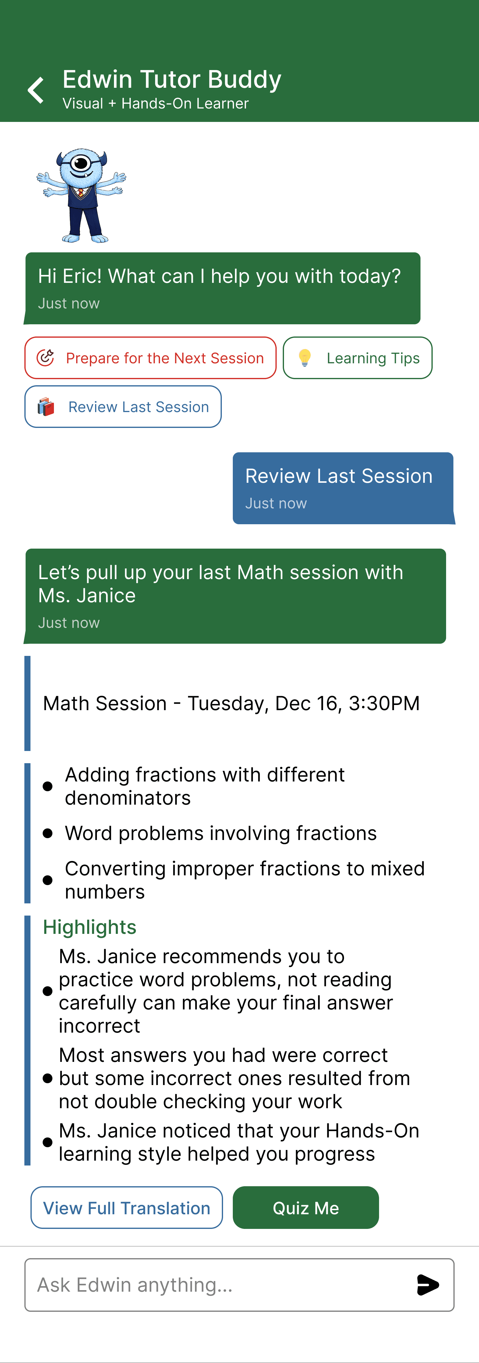 Rather than functioning as static characters. Tutor Buddies are designed as AI companions, meaning students can talk to with their Tutor Buddies to ask questions about tutoring sessions, receive practice lessons and help with their learning process. The AI is designed to form insights from tutoring sessions in order to help students, adding on to their gamification, personalization and motivational purposes.